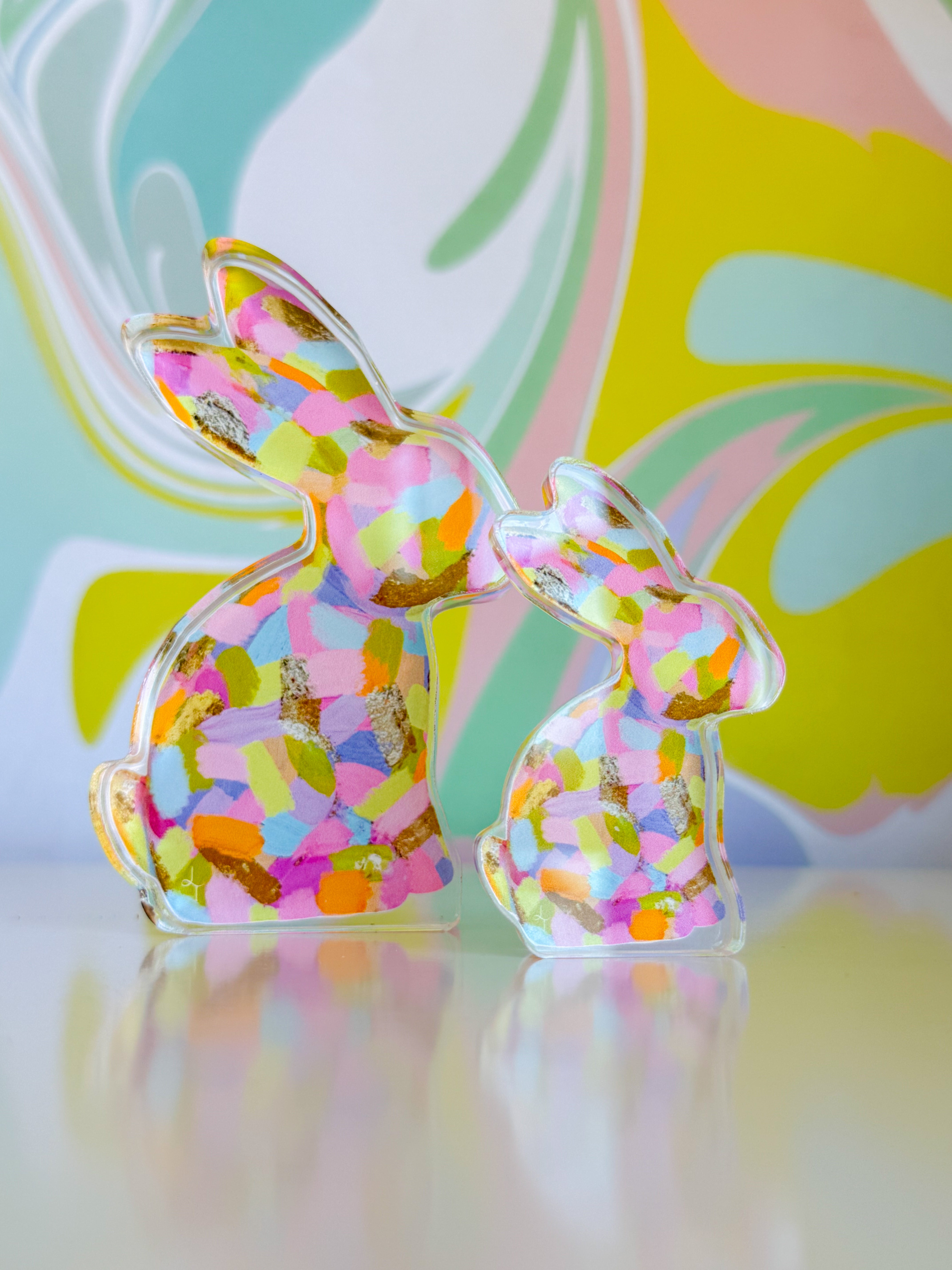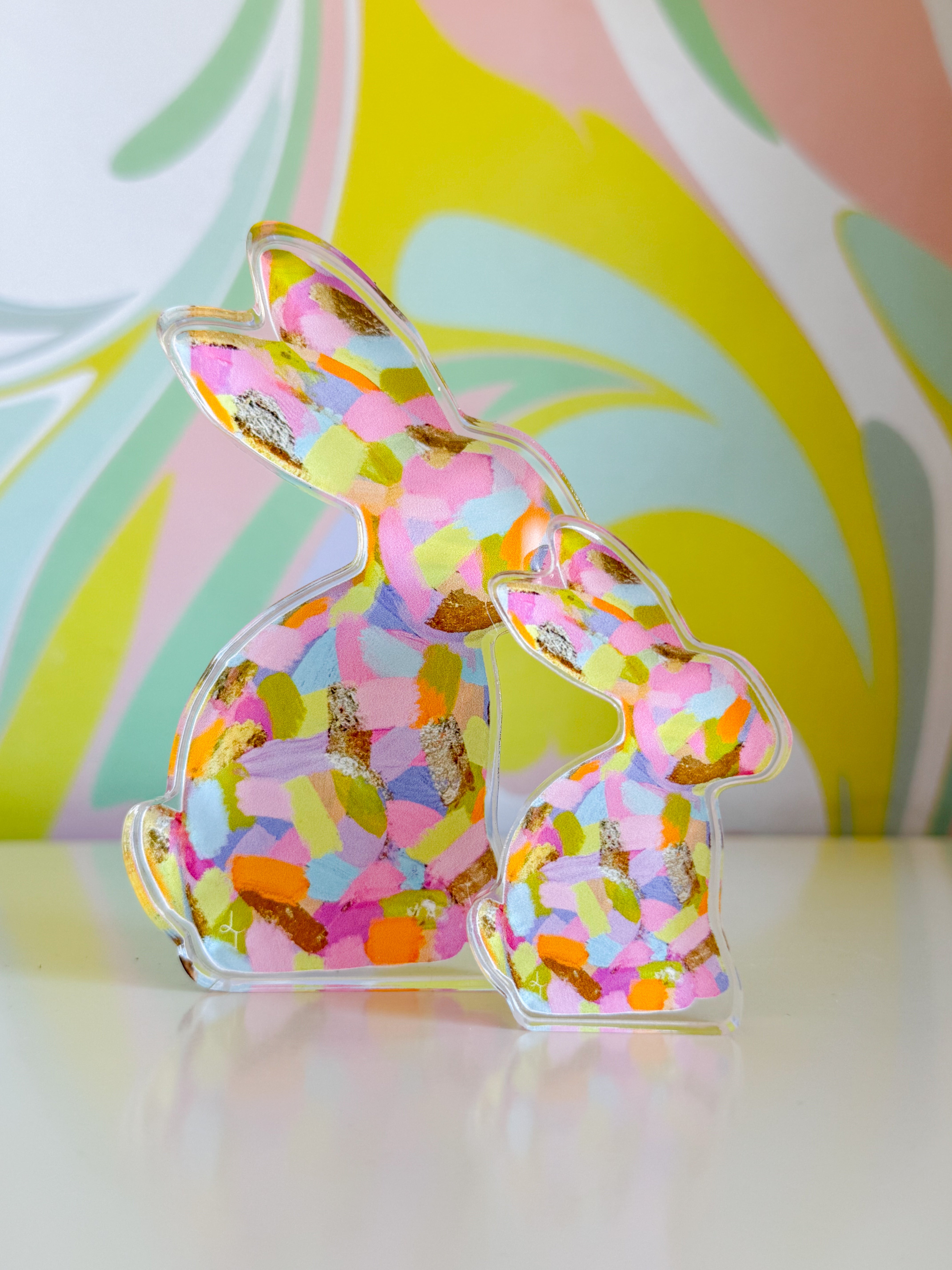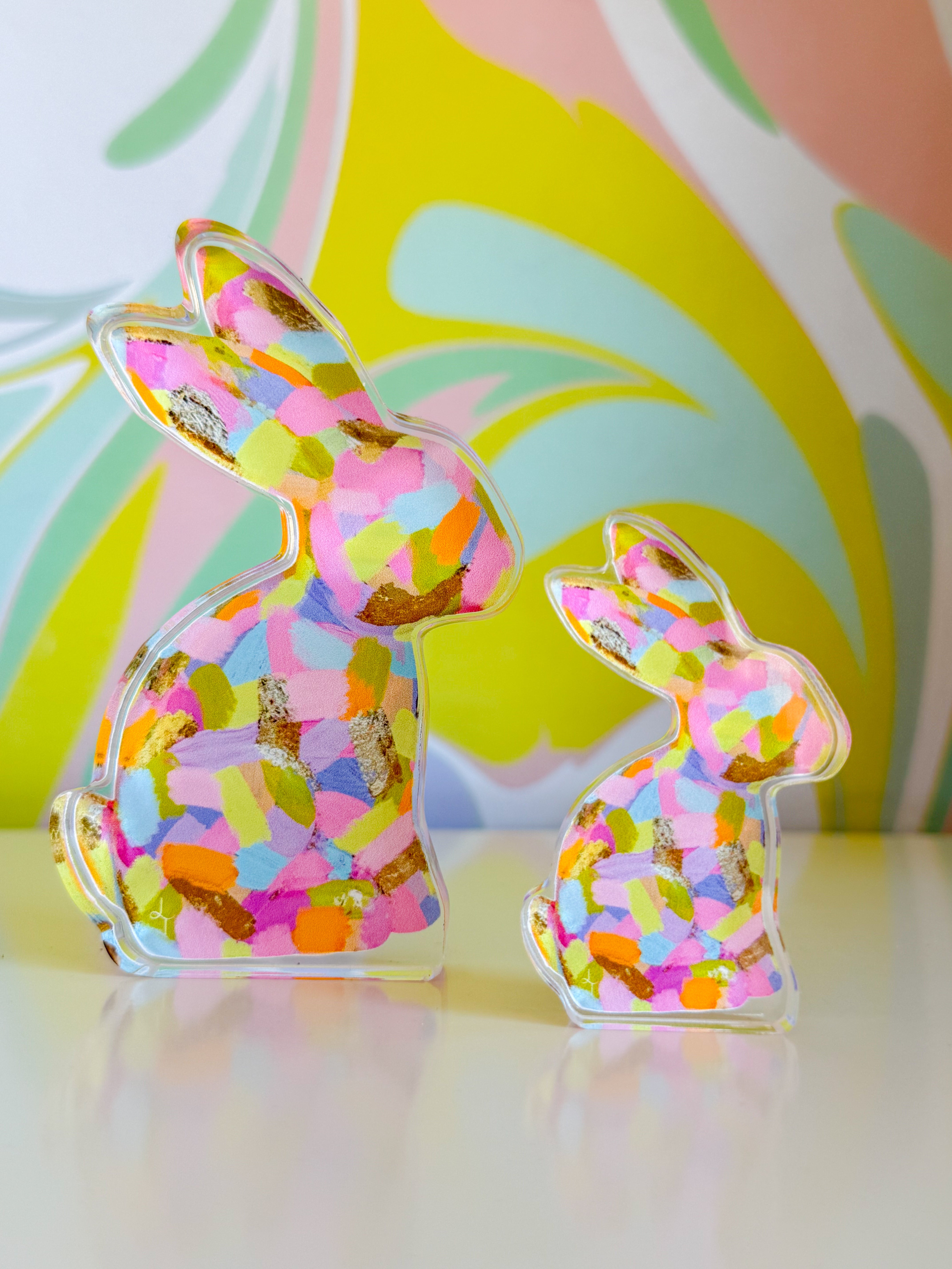 Meet your new favorite companion! This adorable pastel bunny springs to life from original painted artwork, bringing warmth and whimsy to any space. Choose between the generous Large size (5" x 3.1") for a statement piece or the charming Mini (3" x 1.9") for a desk buddy or gift. Each acrylic piece captures the soft, dreamy colors of the original painting, making it perfect for brightening your home, office, or creative corner.