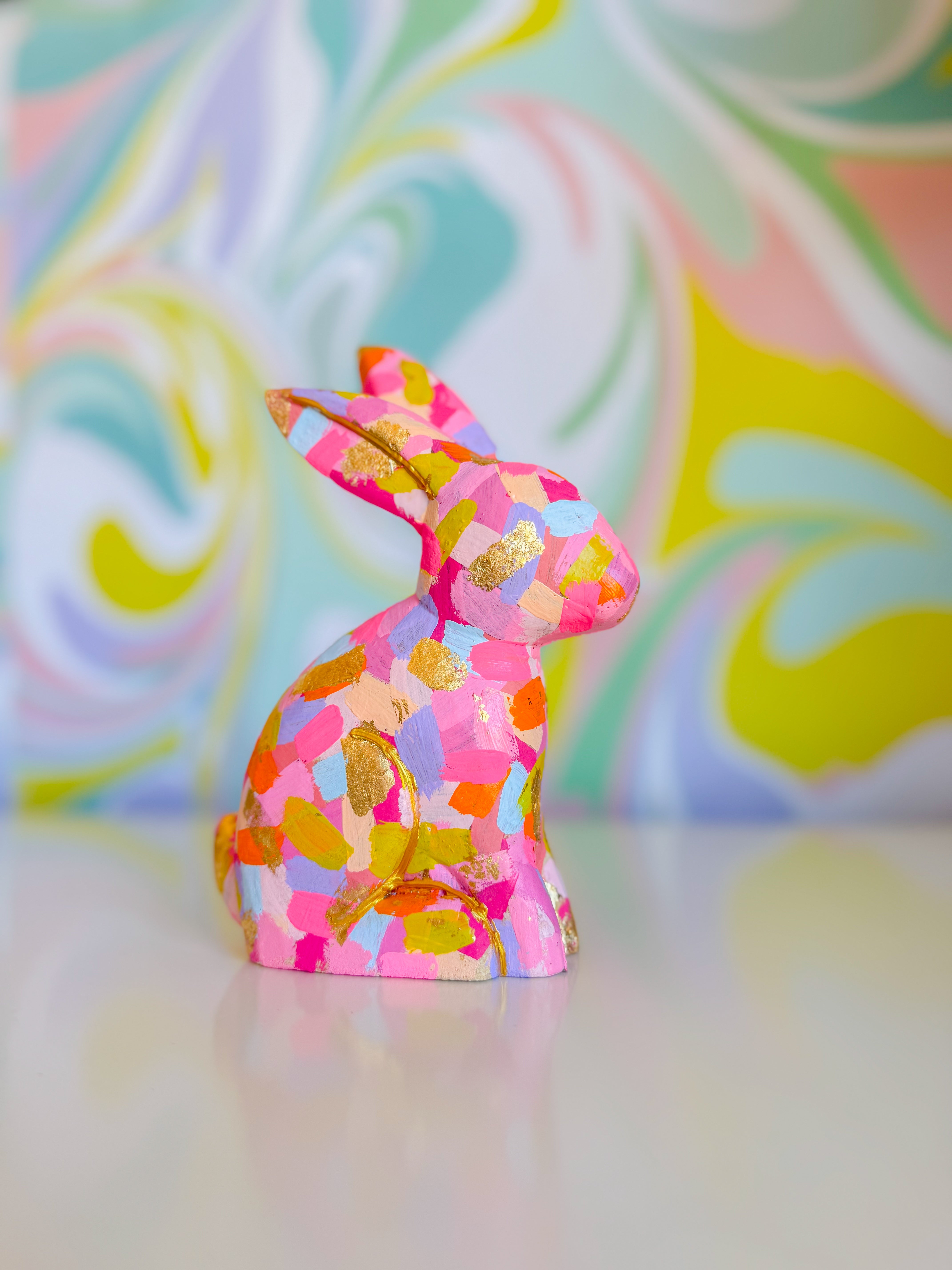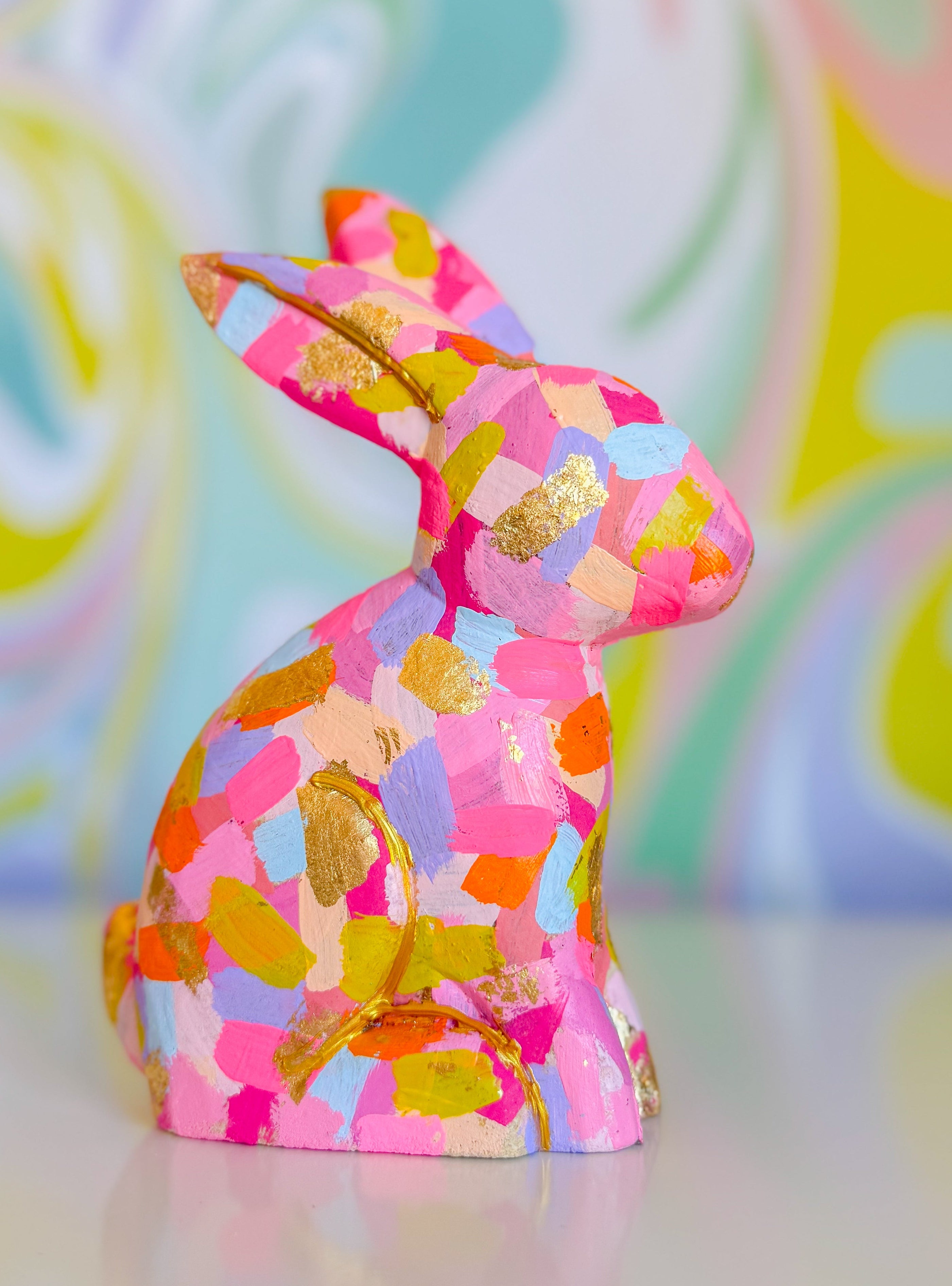 Hop into whimsy with The Confetti Bunny Collection- hand-painted artworks that celebrate joy and playfulness. Each piece features charming bunny designs adorned with shimmering gold leaf detailing that catches the light beautifully. The larger canvas (5x7) makes a bold statement, while the smaller companion (2x3) adds a perfect accent to any space. These original painted figurines bring warmth and personality to your home and are the perfect Easter decor.