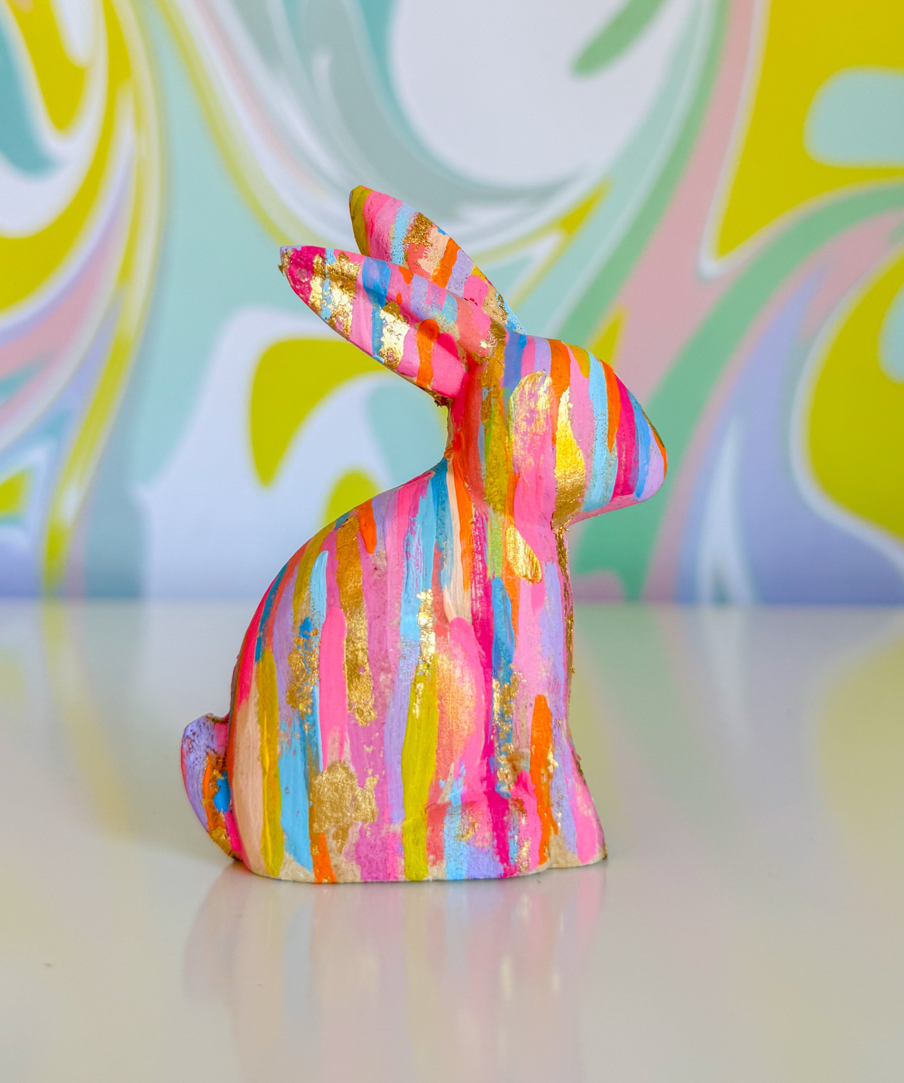 Hop into whimsy with The Confetti Bunny Collection- hand-painted artworks that celebrate joy and playfulness. Each piece features charming bunny designs adorned with shimmering gold leaf detailing that catches the light beautifully. The larger canvas (5x7) makes a bold statement, while the smaller companion (2x3) adds a perfect accent to any space. These original painted figurines bring warmth and personality to your home and are the perfect Easter decor.